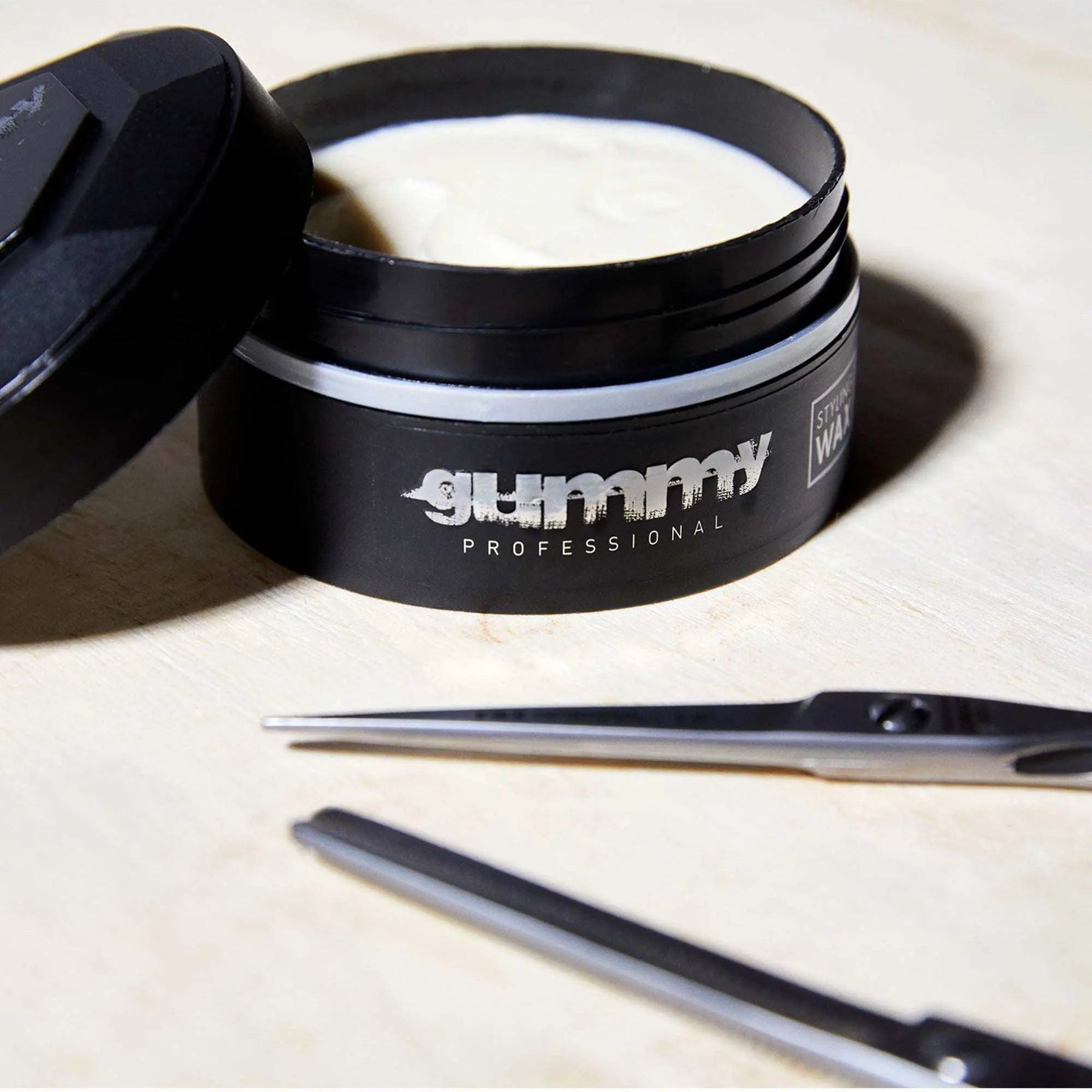GUMMY STYLING WAX 150 ML, open container showing creamy texture, scissors nearby on wooden surface.
